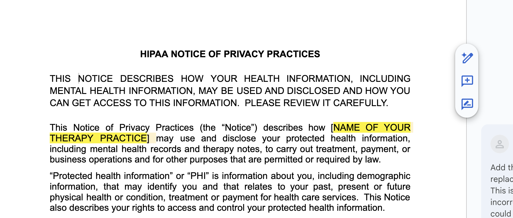 Our plug-and-play HIPAA Notice of Privacy Practices template covers: